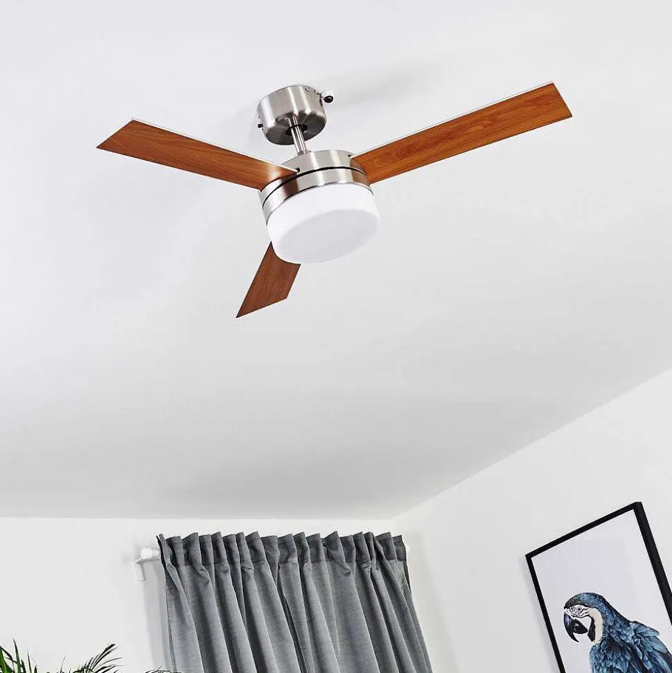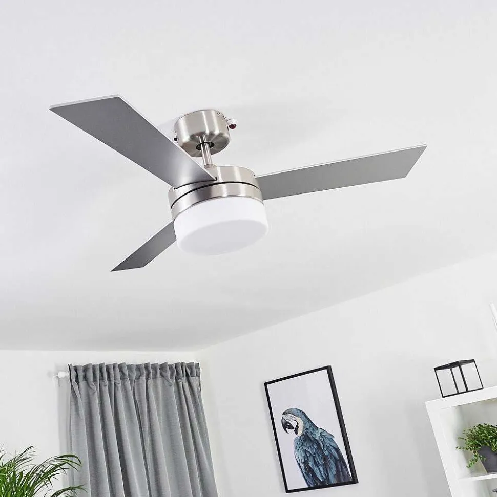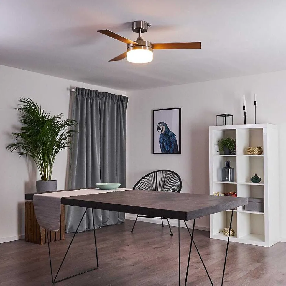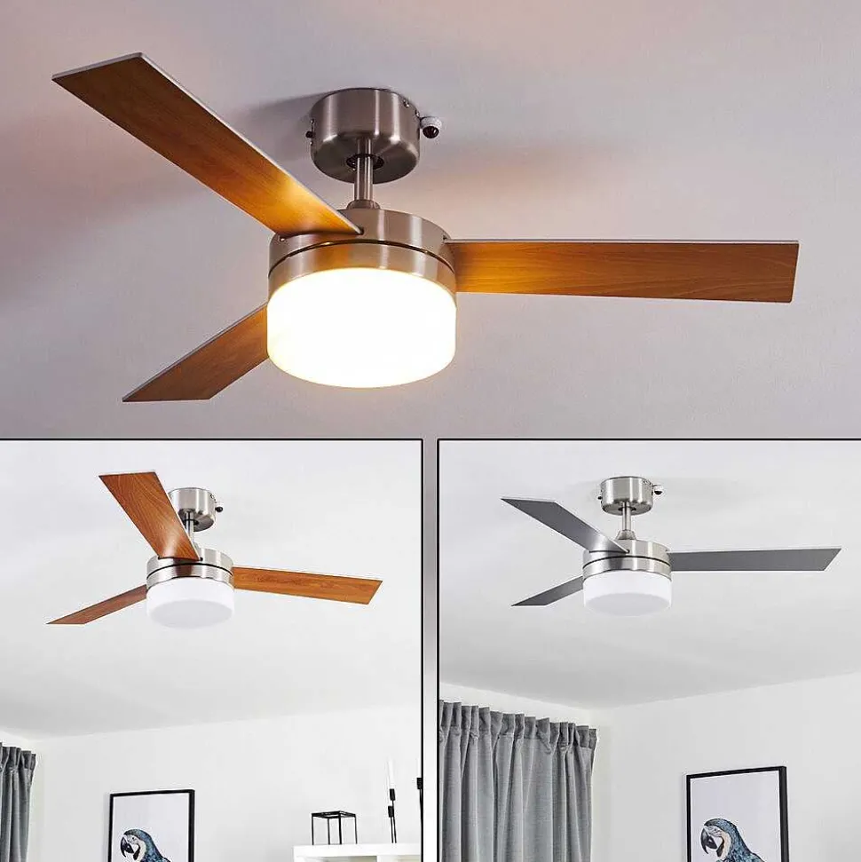 Ventilateur De Plafond Vevey Bois Clair, Nickel Mat, Argente, 2 Lumieres, Telecommandes
